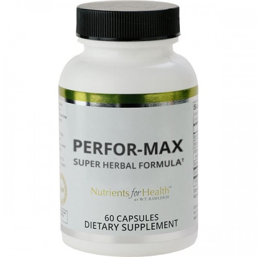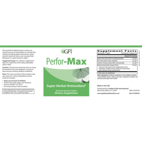 Ingredients in Perfor-Max Capsules: Grape Seed extract - 50mg, pine bark extract - 25mg, Tumeric rhizome extract - 25mg, Botanical blend (50mg) of Green tea leaf standardized extract, hawthorn berry standardized extract, and rosemary leaf extract. Other Ingredients: Dicalcium phosphate, microcrystalline cellulose, croscarmellose sodium, stearic acid, silica, magnesium stearate, and pharmaceutical glaze with vanillin